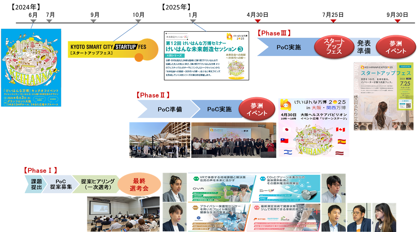 そのような背景のもと、けいはんな万博2025のスタートアップ部会における主要な活動である「けいはんなグローバルスタートアップPoCチャレンジ(KPoC)」(図1)では、けいはんな学研都市が保有する3つの強みである ①強力かつ多様な研究開発力、②住民参加型の実証実験が容易な環境、➂広範かつ強固なグローバル連携ネットワークを活用し、カナダ、台湾、日本のスタートアップ6社と連携し、地域、環境、高齢化、ヘルスケアといった日本が直面する社会課題の解決を目指す4件の実証実験を実施しました。これらは、けいはんなの住民、トレーニングジム、イノベーション施設などの地域資産との協創によって進められたものであり、同時にイノベーション支援人材の育成も目的としています。